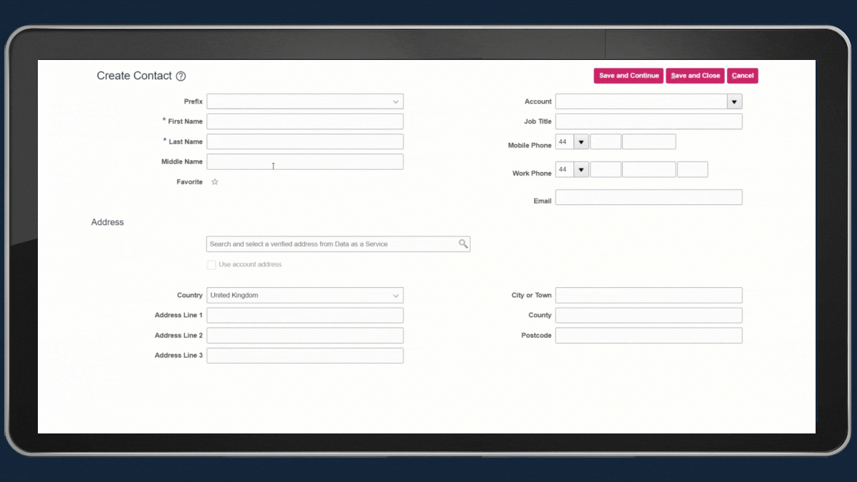 Oracle CDM has a number of tools to facilitate entering good quality data. The out-of-the-box integration with Oracle Data-as-a-Service (DaaS) allows users to create Accounts using a smart data “type-ahead” search into the vast set of customer records from the commercial data provider Dun & Bradstreet. This not only creates an Account rich with Dun & Bradstreet’s extensive data sets, but allows users to create a high-quality account record in a matter of seconds.
