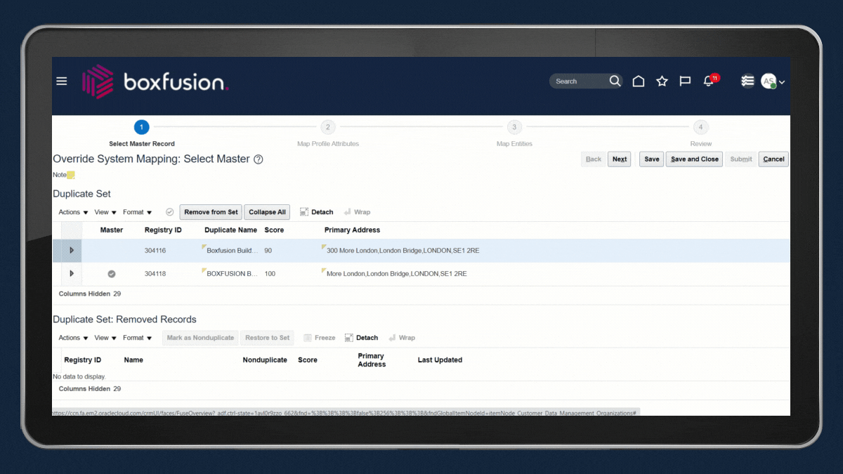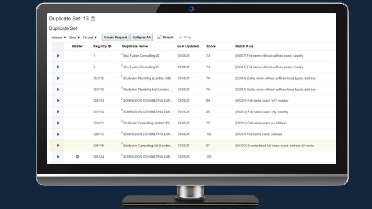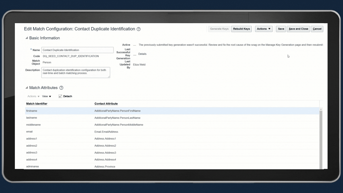 The identification algorithms use Oracle’s powerful Enterprise Data Quality (EDQ) technology, so comparisons like “John” vs. “Jonathan” and “Limited” vs. “Ltd.” are automatically considered and treated the same. The identification rules that triggered a duplicate to be flagged are also shown to data stewards and administrators, giving them the information they require to quickly review and process duplicate records.