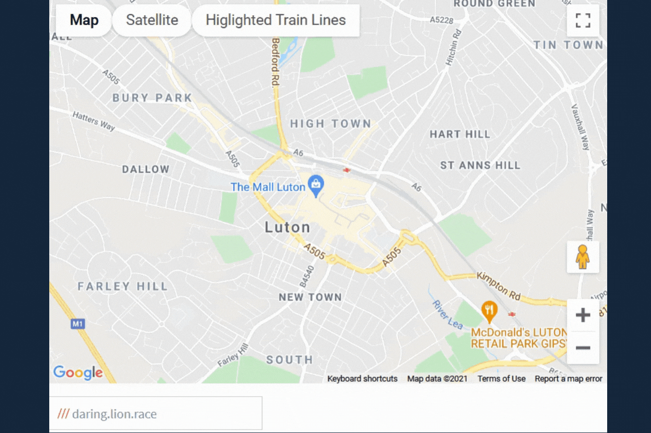 The user can enter a what3words phrase into the what3word search box, which will lead to the location information being called from the Google Maps and what3words APIs. The Google Maps interface will centre on the location linked to the what3words phrase, to provide assurance to the user that the location matches the entered what3words phrase.